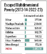 ∙ At the States’ level, Uttar Pradesh topped the list with 5.94 crore people escaping poverty followed by Bihar at 3.77 crore and Madhya Pradesh at 2.30 crore.